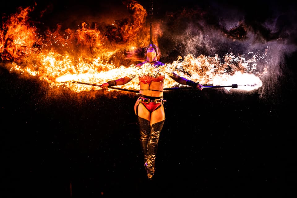 Lusesita präsentiert eine spektakuläre Luftakrobatik-Show mit kunstvollen und hochbeweglichen Elementen, die in einem feurigen Spektakel in Feuerringen hoch oben am Himmel gipfelt. Kein Wunder, dass sie die Herrin der Feuerringe genannt wird.